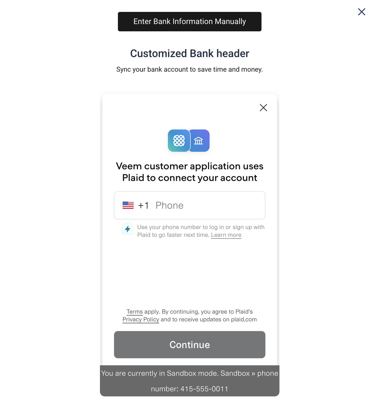 The above screenshot has an "Auto Connect With Plaid" button, which brings you to the Plaid flow. Plaid allows users to connect their bank accounts to various apps and services, including Veem.
